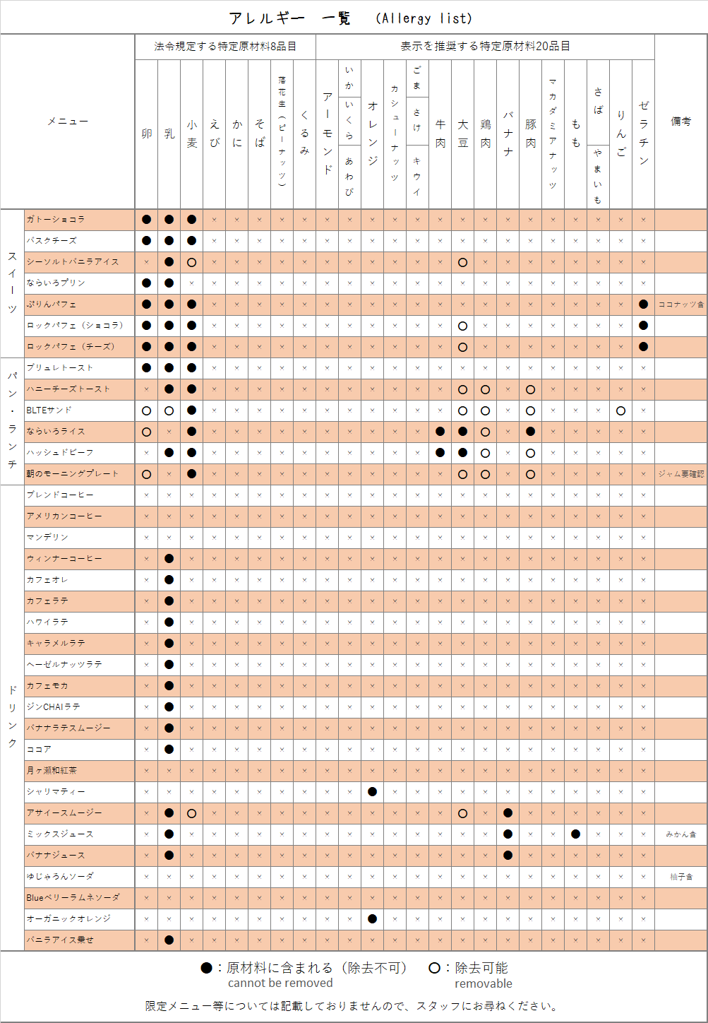 ※申し訳ありませんが、アレルギーの方専用のオリジナルメニューは承っておりません。ご了承ください。